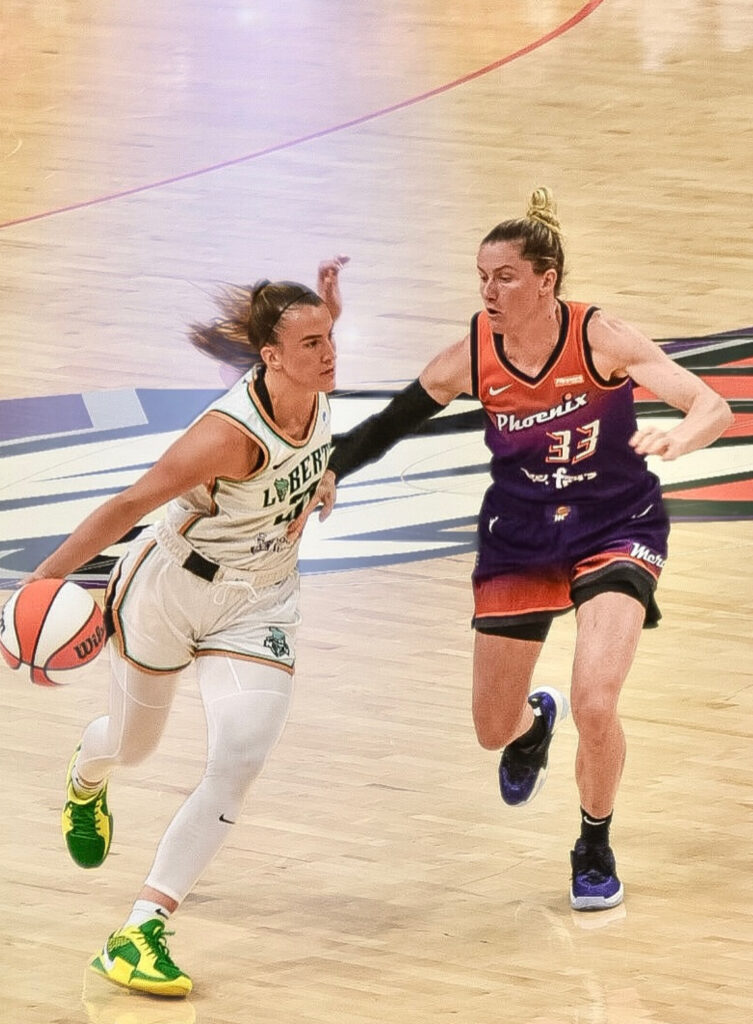 Foto por Kevyn Calvo: Sabally con el balon y Ionescu del liberty cubriendola
